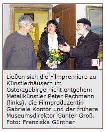Dippoldiswalde. Am 25. März, 19Uhr , hat in der Osterzgebirgsgalerie im Schloss Dippoldiswalde der dritte Teil des von Günter Groß produzierten Filmzyklus' über Künstlerhäuser im Osterzgebirge Premiere. Regie führt wie schon bei den beiden vorangegangenen Streifen Gabriele Kontor. Wie Museumsmitarbeiterin Rikarda Groß mitteilt, werden diesmal folgende Künstler in ihren Ateliers und mit ihren Werken vorgestellt: Bildhauer Friedemann Döhner, Kleinopitz; Bildhauer Peter Fritsche, Freital (Schuhbrunnen Dippoldiswalde, Stuhlbrunnen Rabenau); Maler Carsten Gille, Frauenstein; Maler und Grafiker Wolfgang Petrovsky, Freital; Porzellangestalter Olaf Stoy, Rabenau sowie die Maler Regina und Johannes Zepnick, Reichstädt. (SZ/th)