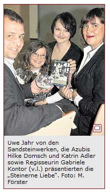 Uwe Jahr von den Sandsteinwerken, die Azubis Hilke Domsch und Katrin Adler sowie Regisseurin Gabriele Kontor (v.l.) präsentierten die „Steinerne Liebe“. Foto: M. Förster